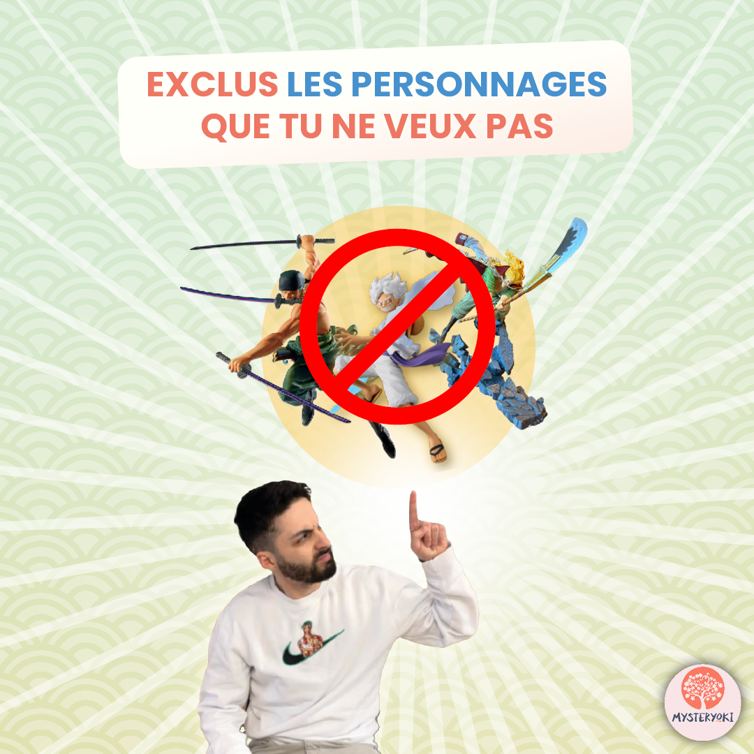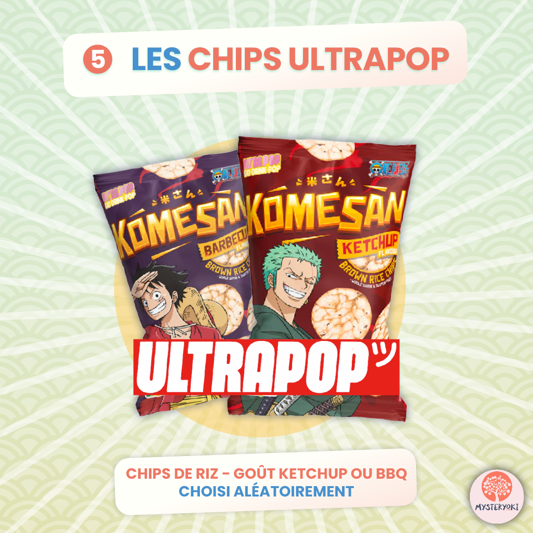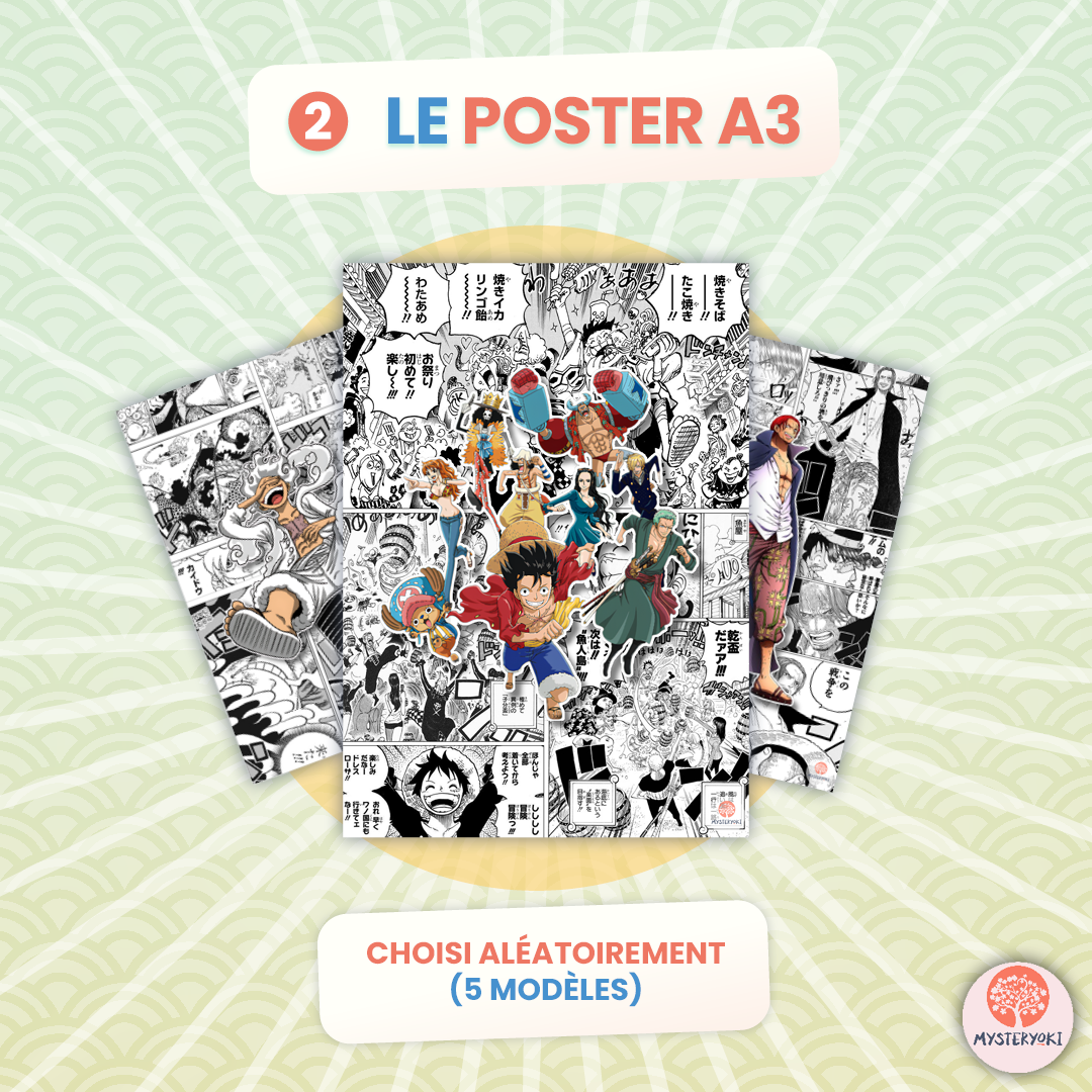 Dans chaque Pack se trouve une Box Mysteryoki One Piece (figurine + devinette + sticker) + une boisson + un pack de chips + un Poster A3 One Piece + un Booster One Piece aléatoire.